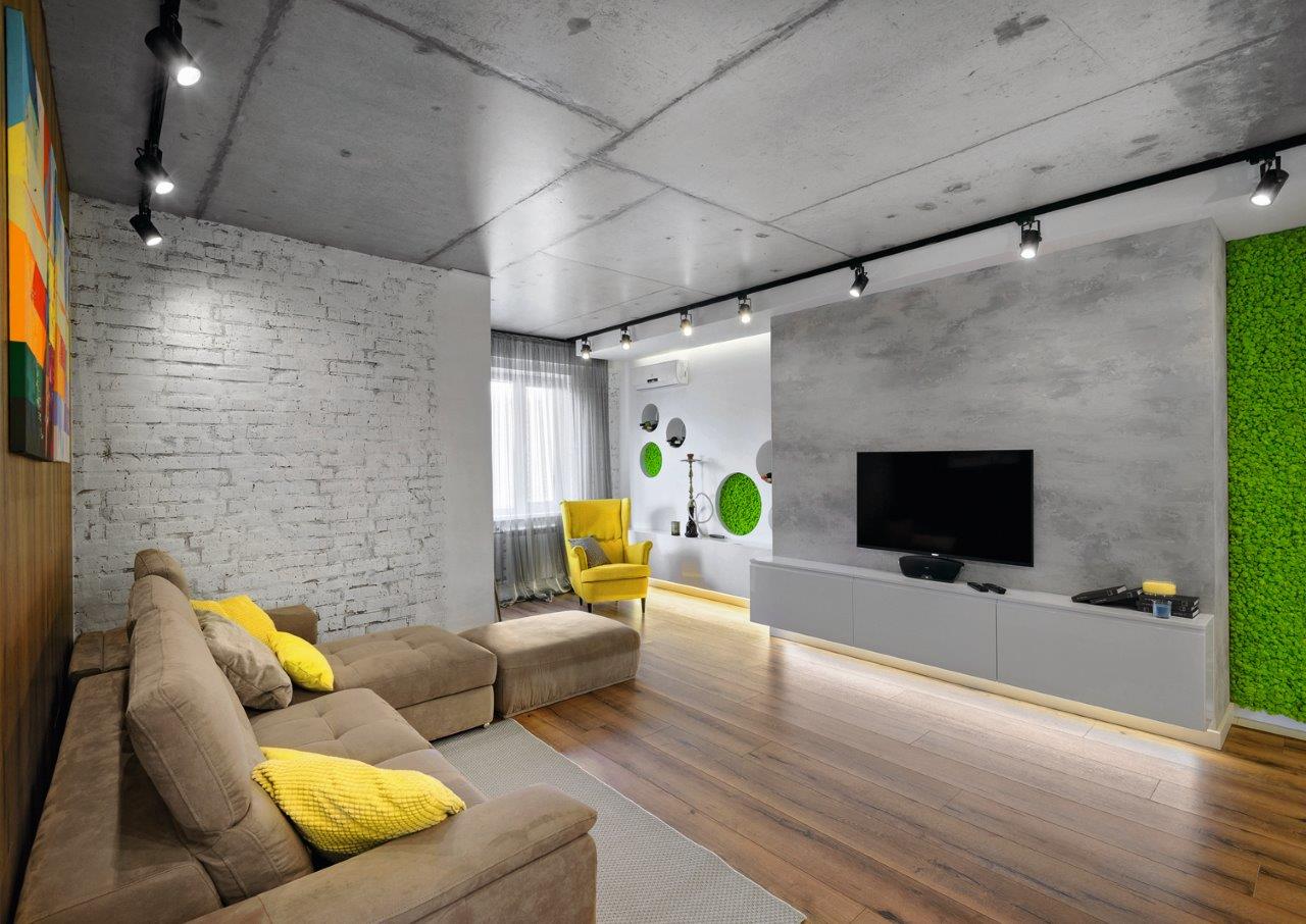 В интерьере присутствуют традиционные черты стиля лофт: бетонные поверхности, неоштукатуренный, но окрашенный кирпич, потолок, расчерченный чёрными полосами шинных светильников. А роль главного акцента отведена фитостене, зелень которой смягчает «суровую» эстетику гостиной. Таким же стабилизированным мхом заполнили и несколько круглых ниш.
