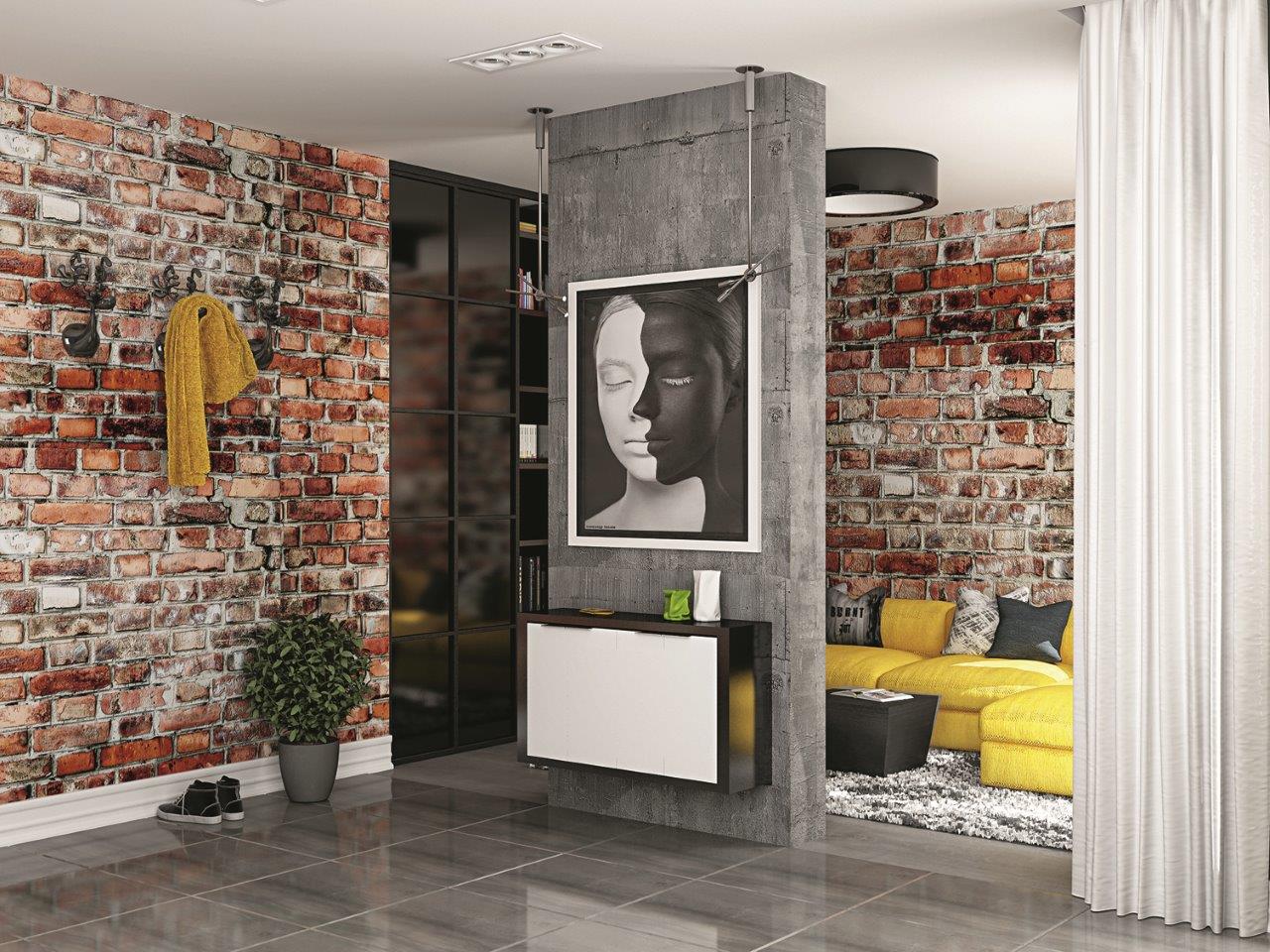 В брутальные материалы (штукатурка под бетон, состаренная плитка под кирпич) контрастируют с глянцевыми поверхностями (пол, мебельные фасады). Обратите внимание, что дизайнер подобрал арт-объект для украшения пространства бетонной колонны, продолжающий тему единства противоположностей. За создание позитивного настроения отвечают «блоки» жёлтого цвета.