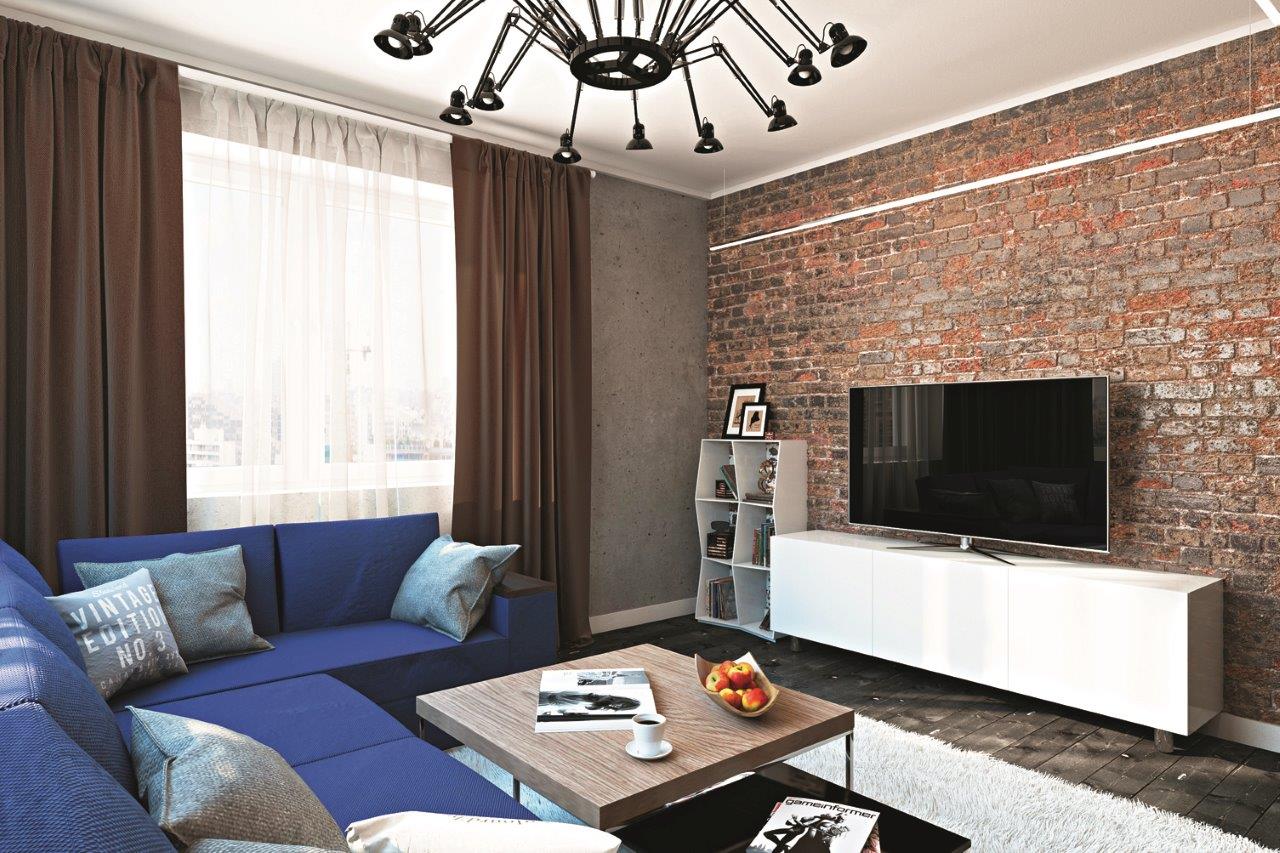 Кирпичная кладка – неотъемлемый элемент лофта, подчеркивающий первозданность складского помещения. Такая отделка на одной из стен гостиной придаст пространству индустриальный шарм. Кроме того, контрастная стена, более яркая и насыщенная по цвету, зрительно увеличит комнату.