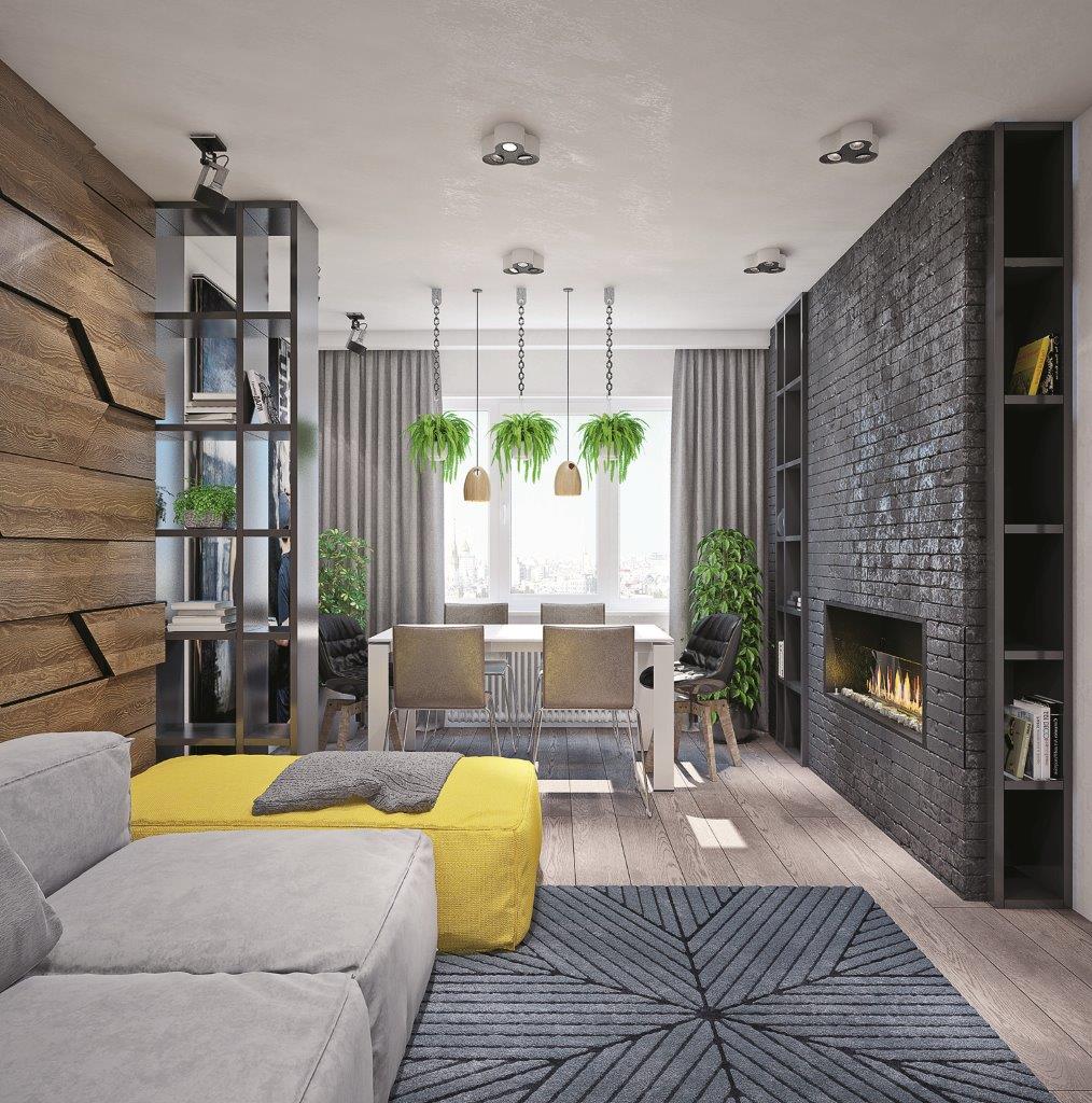 Чёрная кирпичная стена подчёркивает «мужской» характер интерьера. Зрительно смягчает брутальность стеновая панель с характерной природной текстурой, огонь в камине, ярко-жёлтый пуф и растения (напольные и в подвесных кашпо), которыми обыграна обеденная зона.