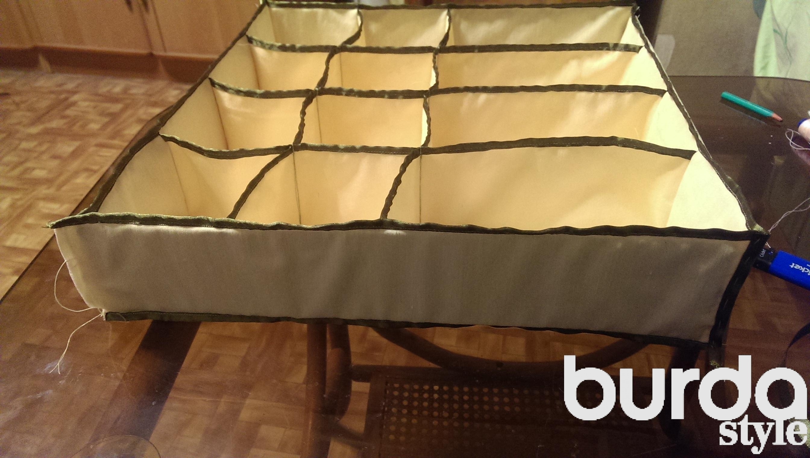 Чтобы представить общую картину будущего органайзера, напишем немного о нем. Органайзер — это коробка, в которой есть много кармашков для белья. Если же у нас нет коробки, её можно сделать самому, если же есть — то остается сделать, лишь перегородку для него.