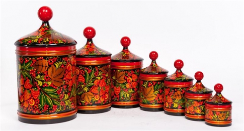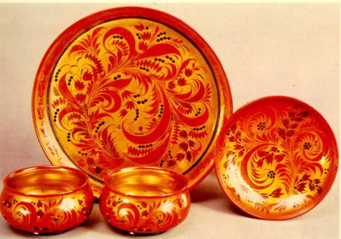 На ярмарках огромным спросом у русских и иностранцев пользовались вещи,расписанные в красные, черные и золотые цвета и украшенные рисунками ягод,листьев и цветов.