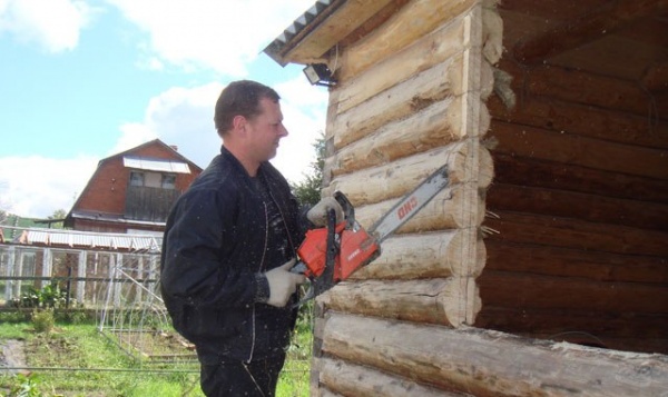 • в стойках по бокам конструкции вырезают паз, с торца бревна в проеме выпиливают шип;