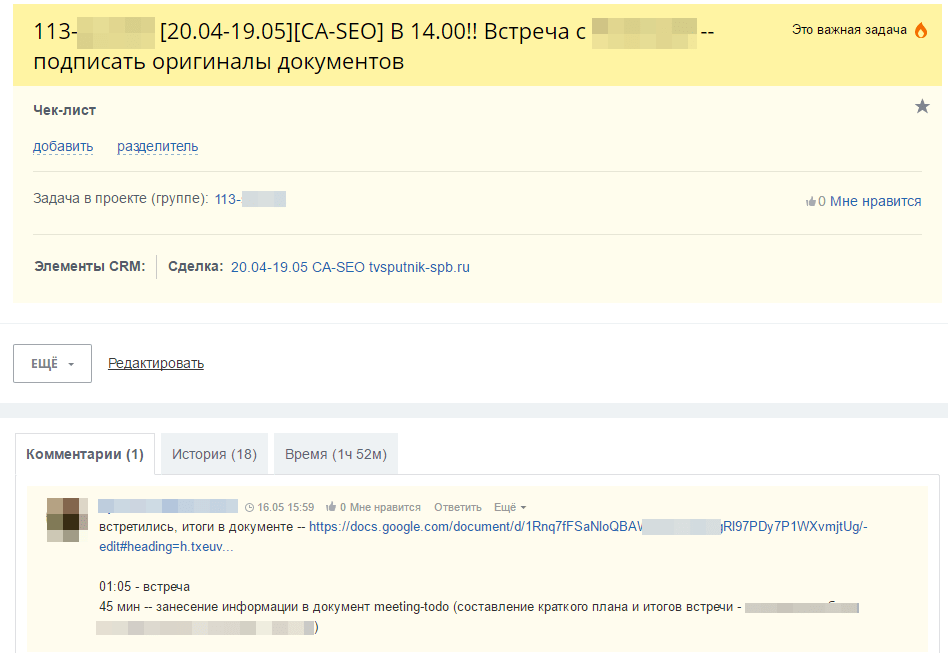- Если у исполнителя есть ощущение, что итоговое время, затраченное на выполнение задачи, может вызвать вопрос у руководителя, необходимо сразу пояснить, “почему затрачено так много времени”. (Пример: Задача: Выставление и отправка счёта Клиенту. Время: 1 час. Пояснение: На выставление счёта затрачен 1 час времени из-за необходимости 3 раза пересогласовывать формулировку с Клиентом по его инициативе)