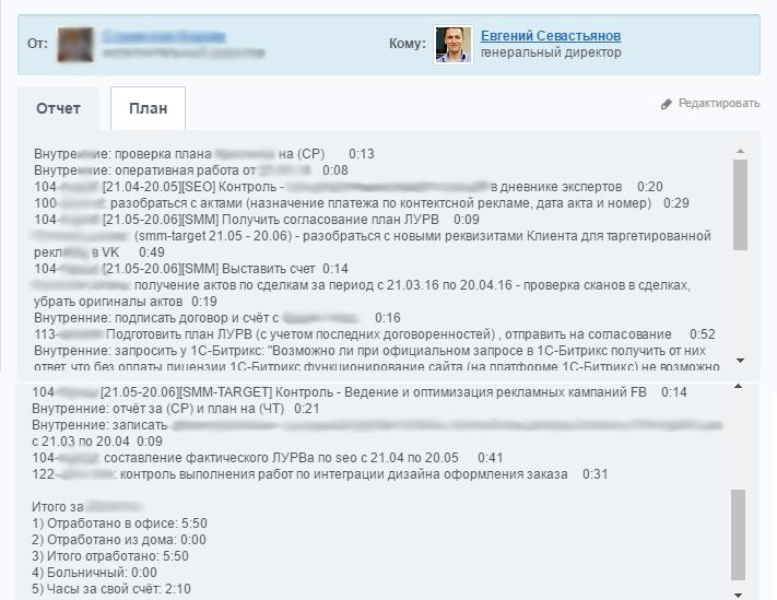 На примере продемонстрирован список задач из отчёта, сделанного в Битрикс24 (система позволяет централизованно работать в рамках компании и учитывать время по задачам). При должной организации планирования и учёта рабочего времени по задачам, все отчёты будут формироваться автоматически.