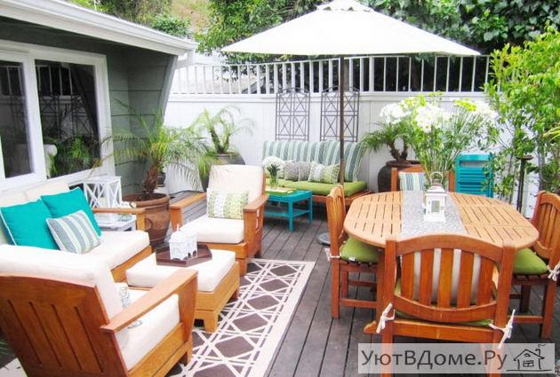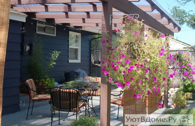 Стены могут быть полностью открытыми, чтобы пропускать максимальное количество света и свежего воздуха, могут дополняться плотными деревянными или пластиковыми жалюзи, которые дадут необходимое затенение. Третий вариант – это застекленные стены, внутри которых получится закрытое помещение, пригодное к эксплуатации и в холодное время года.