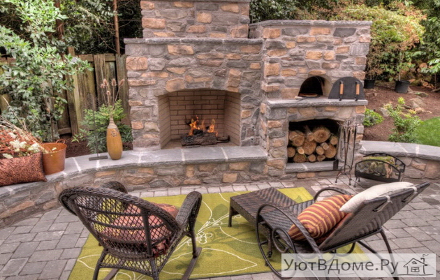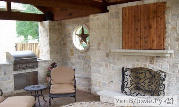 Ее главным атрибутом является очаг, помещающийся в рабочей зоне. Иногда ограничиваются только плитой, но для посиделок с друзьями лучше поставить кирпичный мангал, вертел, барбекю или печь.