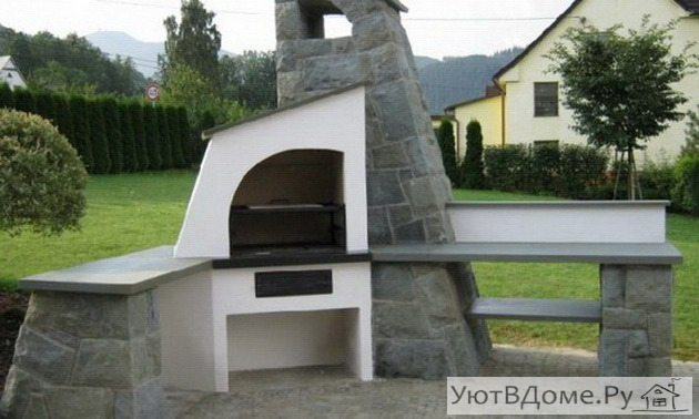 Если участок огражден забором из кирпича, хорошо выполнить кухню из этого же материала либо с применением природного камня. Такое сооружение не боится влияния внешней среды и простоит ни одно десятилетие.