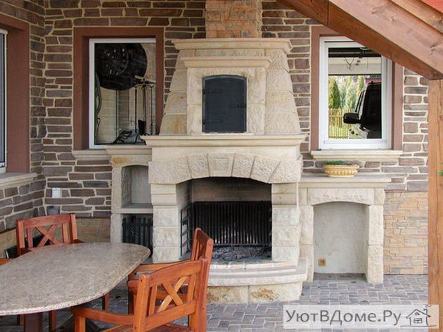 Такая кухня может быть самостоятельным сооружением либо пристройкой к основному дому, хозблоку или бане. Ее можно оснастить камином, барбекюшницей либо печью.