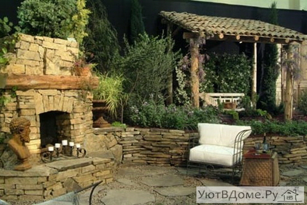 Это может быть газовая плита, мангал или приспособление для барбекю, вертел, иногда даже сооружают подобие деревенской уличной печи – в ней хорошо запекать мясо и рыбу, а также печь пироги. Всего на такой кухне две зоны – для готовки и для отдыха.