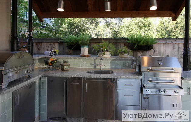 Не стоит думать, что летняя кухня на даче своими руками – это исключительно наше изобретение и такого нет во всем мире. На самом деле, в странах с любым климатом очень часто встречаются именно такие модели, которые позволяют готовить в небольших закрытых патио, задних дворах домов, причем, вне зависимости от того, жаркое лето или нет. Дело же в приятном процессе приготовления еды, особенно, блюд на решетке с углями – барбекю. Только для нее одной уже можно установить кухонные приборы под .