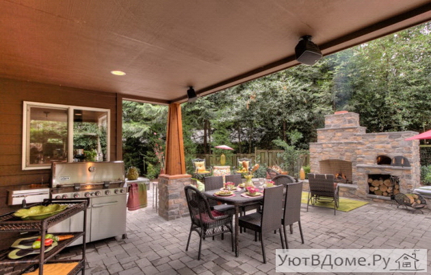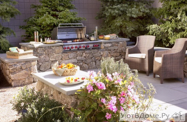 • лучше, если кухня будет в саду, под сенью деревьев, которые защитят от солнца