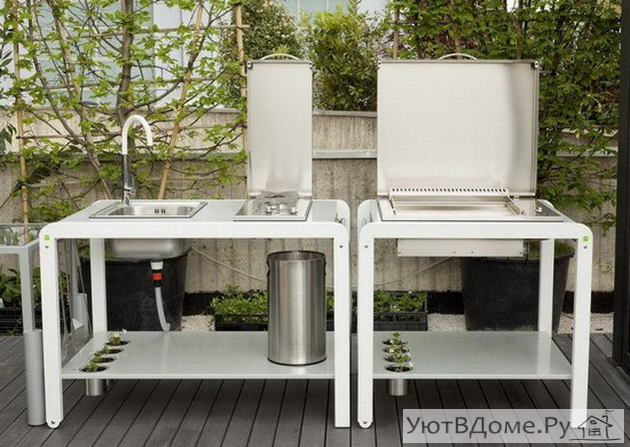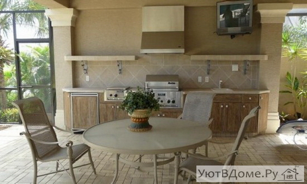 Важно!От варианта кухни под открытым небом в условиях российских широт лучше отказаться. Жаркое солнце, дождь и град могут преподнести неприятные сюрпризы.
