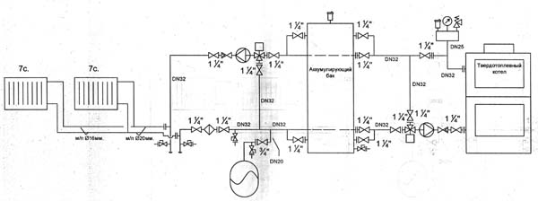 Для совместной работы газового и твердотопливного котла разработана многоконтурная система отопления, представляющая собой два независимых контура.
