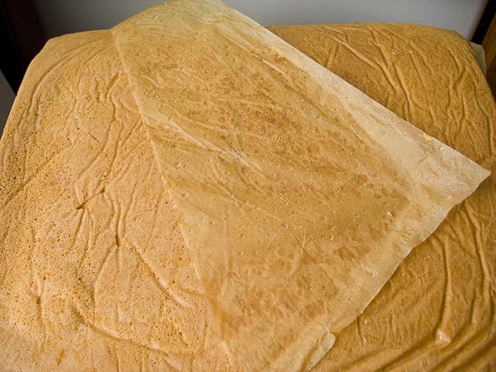 Остывшие коржи освобождают от пергамента. Если бумага плохо отстает, то ее можно слегка намочить водой.