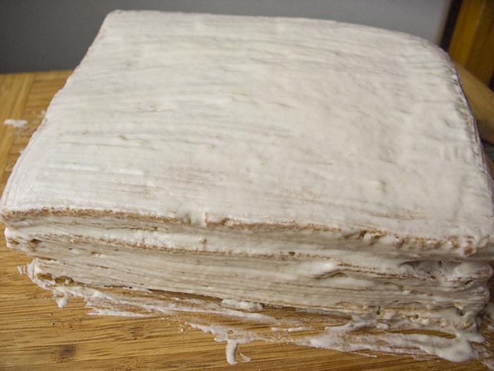 Выкладываем пастилу одна на другую прямоугольной стопкой, каждый слой промазываем оставленным кремом, затем опять подсушиваем в духовке еще два часа, при той же температуре 70 градусов.