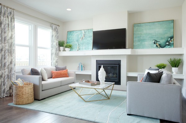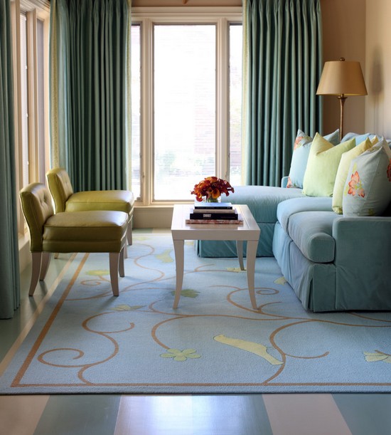 Небольшие коврики подходят для расстановки цветовых акцентов. Их можно располагать перед креслами или, если в комнате есть камин, то перед ним.