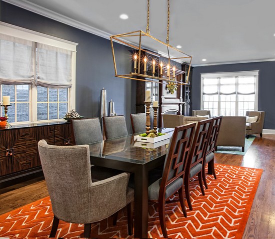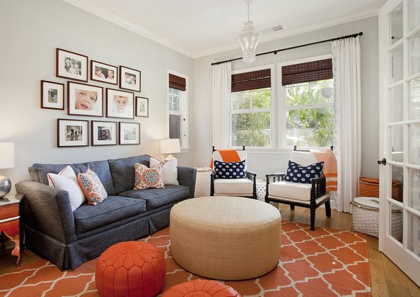 1. Под цвет мебели, которая будет располагаться на нем или возле него. Так, на сером ковре может стоять серый диван, а на синем ковре — обеденный стол с синими стульями.