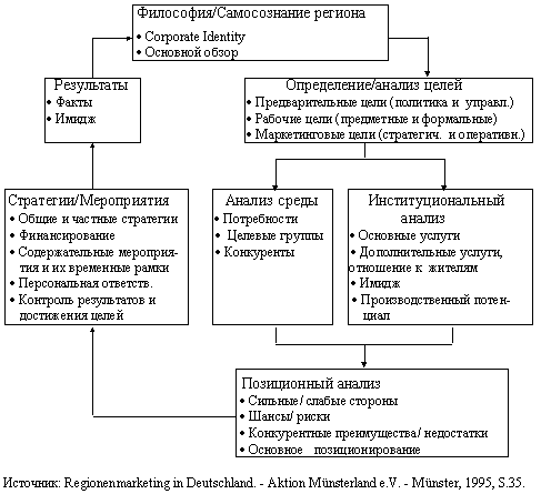 Регион находится на пересечении требований различных целевых групп (туристов, уже имеющихся предприятий, населения, стремящихся к размещению в регионе новых предприятий). Общее внутреннее самосознание жителей служит при этом базой для достоверного внешнеговыступления региона вовне.