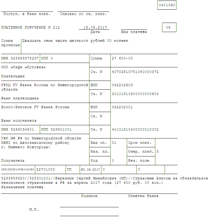 Изменим условия примера 1. Общество и предприниматель договорились, что первое перечислит в мае 2017 года за ИП в бюджет на обязательное пенсионное страхование по работникам за апрель 2017 года в размере 27 600 руб. У общества открыт расчетный счет № 40702810751080000372 в том же банке, что и у ИП.