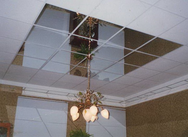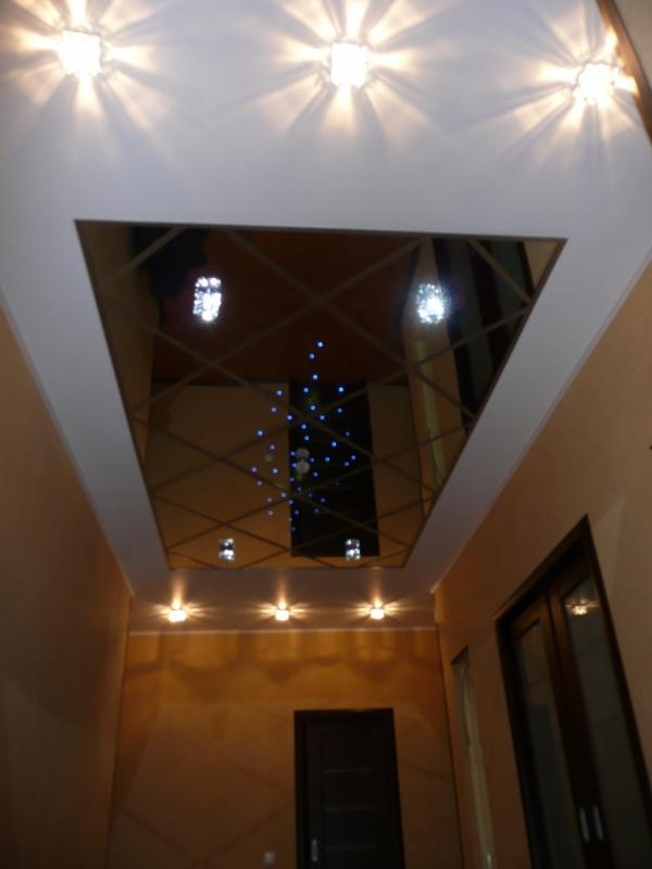 Устройство потолка зеркальными плитками.Это могут быть полистирольные плитки, покрытые зеркальной пленкой, дающей размытое изображение, или традиционные зеркальные. Крепят их на специальный клей или шурупы. Следует помнить, что зеркальный потолок — своеобразный, даже экстравагантный вариант отделки, и применять его надо осторожно. Чтобы не превратить прихожую и коридор в своеобразную «комнату смеха». Такой способ отделки очень хорошо подходит для маленьких темных помещений, где надо усилить свет. Отражаясь в зеркальных плитках, свет даже от одного осветительного прибора будет хорошо освещать прихожую.