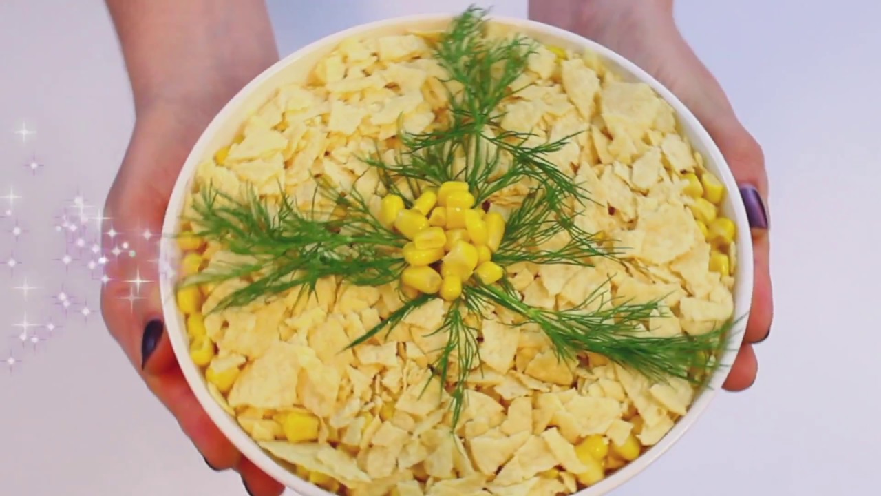 Оригинальная закуска с украшением из чипсов станет украшением любого стола.