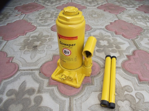 4.Силовой механизм. В качестве нажимного механизма в прессе для яблок используется домкрат или винт. В устройстве для отжима сока будет вполне достаточно гидравлического автомобильного домкрата грузоподъемностью 3 тонны. Для более уверенной работы можно использовать домкраты создающие усилие равное более 3 тонн. Винт для пресса найти сложнее, а домкрат имеется у каждого автолюбителя. Под домкрат нужно напилить дощечек для подкладывания во время отжима.