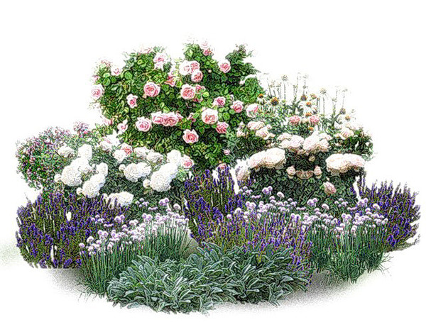 - розарий в холодных тонах. Вся клумба выполняется в холодной розово-сиреневой гамме, что вызывает чувство свежести и прохлады. На схеме присутствуют следующие цветы: 1 – чистец, 2 – герхера, 3 – , 4 – роза Вильям Шекспир, 5 – роза Королева Швеции, 6 – клематис, 7 – роза Гертруд Джекилл, 8 – роза Мэри Роуз.