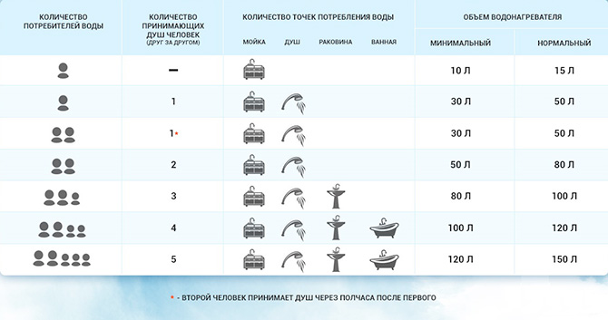 - Для кухни и душа двум пользователям понадобится вместительность от 80 литров.
