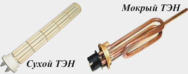 Для нагрева в накопительном бойлере устанавливается ТЭН. Он бывает сухого и мокрого типа.