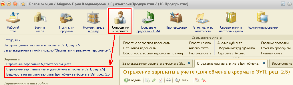 После установки описанных настроек, в разделе Сотрудники и зарплата, станут доступными команды вызова обработок выгрузки и загрузки данных, а также документы, в которые будут загружаться данные.