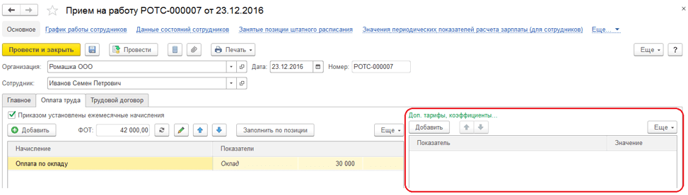 На вкладке «Главное» указываем дату приема, количество ставок, график, должность, подразделение и территорию, если в учетной политике настроено ведение учета в разрезе территорий.
