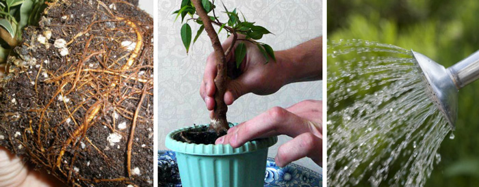 Если на растении появились признаки заболевания указанные выше, растение следует извлечь из горшка и аккуратно стряхнуть землю с корней. После того как корни очищены осмотрите их очень внимательно. Если корни вашего фикуса практически все потемнели и на ощупь очень мягкие, то растению уже ничто не поможет и можно его выбросить.