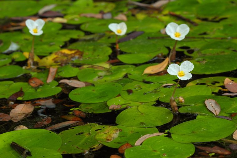 Следующий плавучий герой нашего рассказа водокрас (Hydrocharis). Его листья похожи на кувшинку, только в несколько раз меньше: округлые, сердцевидно вырезанные у основания. От короткого стебля отходят корни с воздушными полостями. Именно благодаря им водокрас плавает. Цветы у него белые с желтыми пестиками и тычинками. Облетают быстро, но зато сменяются в течение всего лета. Над водой они выделяются на 3-5 см. Зимует водокрас в пруду. Осенью у него отмирают все листья, а почки опускаются на дно, затем, в начале лета поднимаются, и из них появляется новое растение. Особый эффект от водокраса – он хорошо очищает воду и не дает расти водорослям.