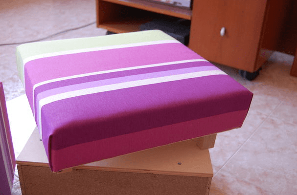 Обшивку начинают делать с верха. Для этого создают требуемую форму обивки и клеем фиксируют на внешней стороне крышки. Если в пуфе нет верха, то поролон или другая обивка прикрепляется сверху него. Затем этим материалом обшиваются и бока. В конце изделие, при желании, украшается декоративными элементами, например, кисточками, стразами, каретным или тканевым бантиком.