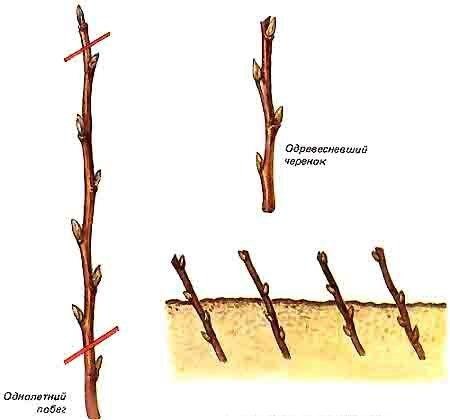 Одревесневшие черенки заготавливают из хорошо развитых однолетних побегов. Предпочтение отдают средней и нижней части побега. Верхушка укореняется хуже, но быстрее плодоносит. Длина черенков должна быть 15-20 см (4-5 почек), толщина не менее 6 мм.