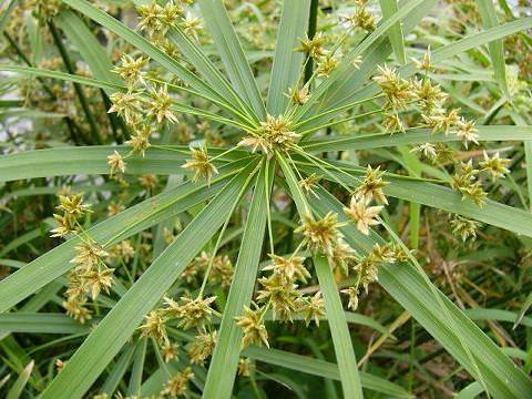 Циперус зонтичный – многолетнее растение родом с Мадагаскара. Его высота составляет 1.5-1.7 метра. Характеризуется прямыми слегка округлыми стеблями и густой зонтиковидной кроной. Также существует вариегатная форма этого вида с белой полосой на листьях.