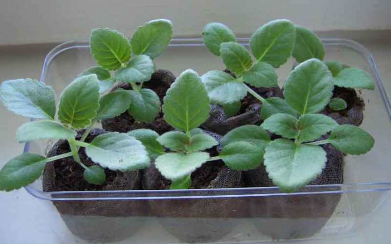 Как выращивать глоксинию и заботиться о ней? Примерно через неделю после посадки семян, иногда немного позже из грунта проклюнутся первые маленькие зеленые ростки, которые периодически нужно поливать и несколько раз пикировать. Через месяц после прорастания на ростках образуется несколько настоящих листочков. В это время молоденьким глоксиниям станет тесно в одной емкости, поэтому их необходимо пикировать. Благодаря этой важной процедуре активизируется рост и развитие рассады, в итоге молодые глоксинии быстрее станут окрепшими и взрослыми.При извлечении глоксиний из общего контейнера нужно действовать очень осторожно и аккуратно, чтобы не повредить молодую корневую систему и крону соседних растений. Первая пересадка выполняется в свежий грунт примерно по десять глоксиний. Новая емкость снова помещается в тепличные условия под фитолампу, или на хорошо освещенный подоконник. При выращивании этого цветка из семян может потребоваться от 2 до 4 пересадок, это количество зависит от вида и характеристик глоксиний, а также от густоты посева семян. Во время пикирования не стоит стараться удалить всю старую землю с корней, этим можно только травмировать корни. Пересаживать можно с небольшим земляным комом.Вторая и третья пересадка глоксиний выполняется в отдельные горшки, объем которых не больше 100 граммов. Через несколько дней после пересадки в эти стаканчики, можно начинать закаливать растения, убирая с них целлофановые пакеты. Сначала необходимо открывать тепличку на 5-10 минут, и каждый день время проветривания нужно понемногу увеличивать.Когда молодым кустикам будет примерно 10 недель, их можно пересадить в индивидуальные горшки. Желательно брать емкости небольших размеров, диаметр которых максимум 10 сантиметров, и высота примерно такая же. Молоденькие глоксинии очень плохо переносят сквозняки и резкие температурные перепады. Поэтому проветривание рассады должно быть минимальным. Кроме того, воздух возле растений должен быть все время влажным, для этого цветоводы размещают вокруг глоксиний емкость с водой.