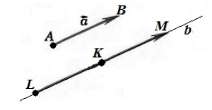 Обозначим точкой $A$ — начало вектора $overrightarrow{a}$, а точкой $B$ — конец вектора $overrightarrow{a}$. Проведем через точку $K$ прямую $b$ параллельную вектору $overrightarrow{a}$. Отложим на этой прямой отрезки $left|KLright|=|AB|$ и $left|KMright|=|AB|$. Рассмотрим векторы $overrightarrow{KL}$ и $overrightarrow{KM}$. Из этих двух векторов искомым будет тот, который будет сонаправлен с вектором $overrightarrow{a}$ (рис. 2)