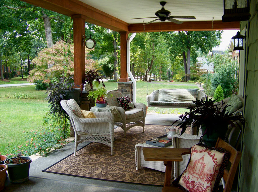 Кресла-качалки, установленные на открытой террасе, под навесом или в беседке – отличная возможность не только организации места отдыха и расслабления на свежем воздухе, но и создание максимально комфортной обстановки на дачном или приусадебном участке.