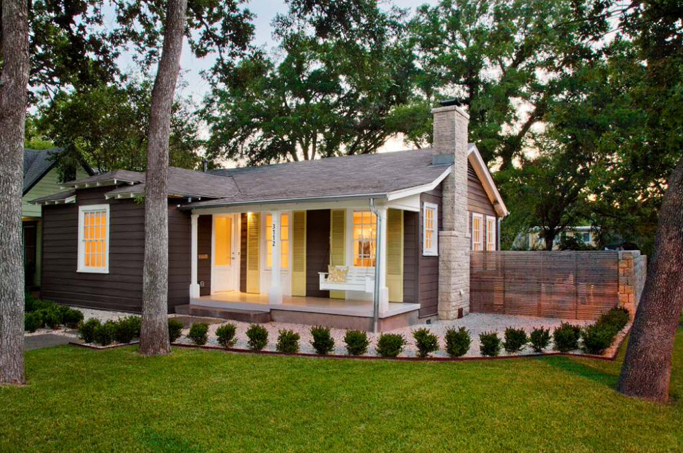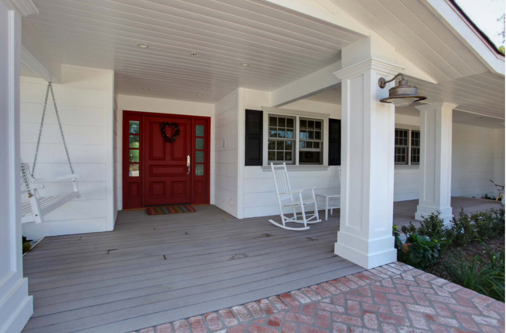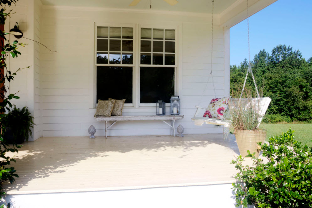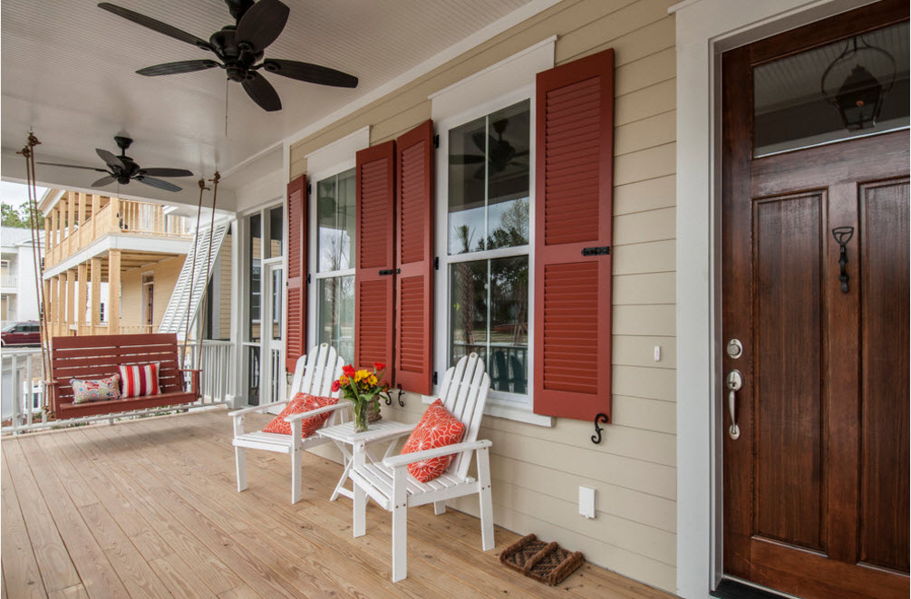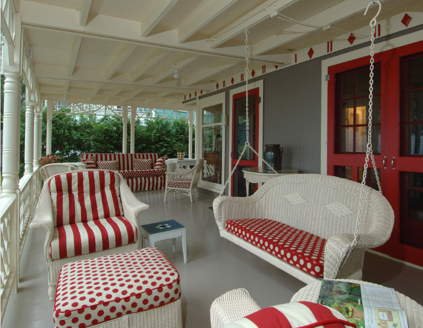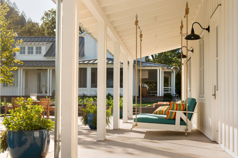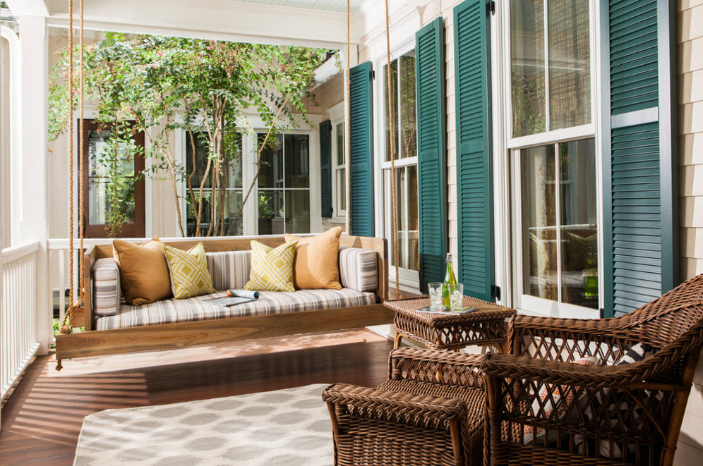 Еще один вариант выбора цвета для качелей – сочетание яркого или контрастного оттенка с каким-либо элементом террасы на фоне нейтрального или светлого образа всего строения. Например, яркие качели могут совпадать по цвету со ставнями или входной дверью, оформлением крыльца или перил на помосте (террасе).