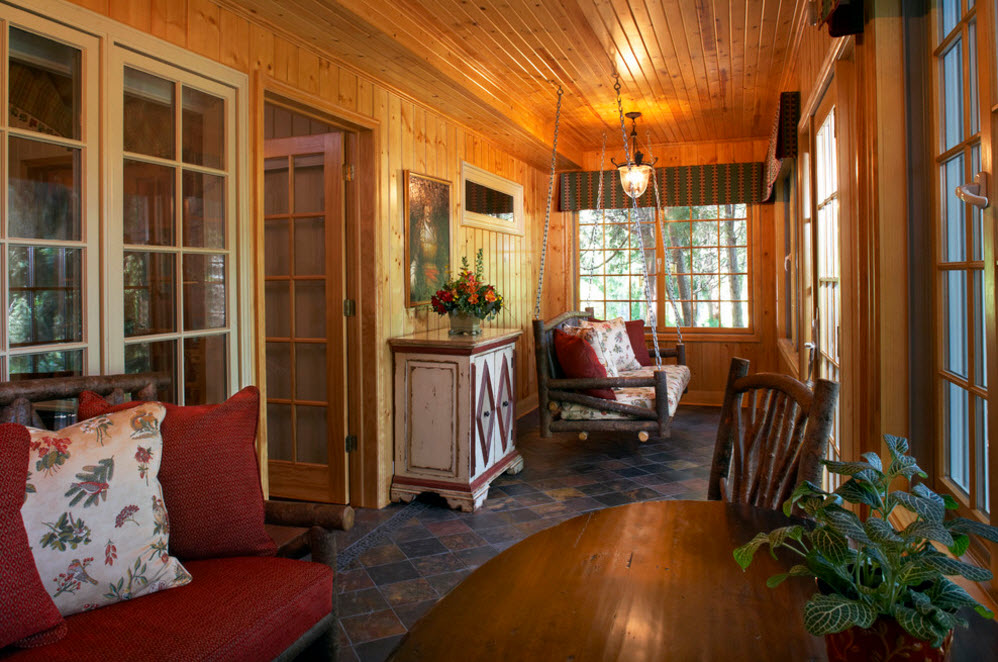 Подвесить садовые качели можно и в помещении застекленной террасы или веранды. Если в вашей местности часто идут дожди или даже летом редко бывают теплые дни, то такой вариант может быть единственно доступный с точки зрения практичности и комфорта.