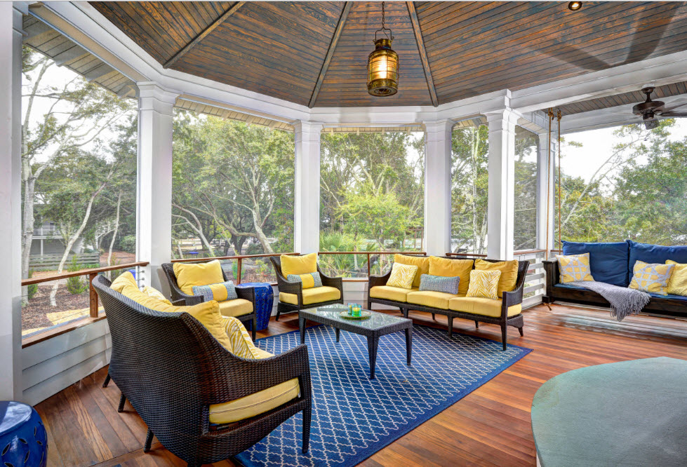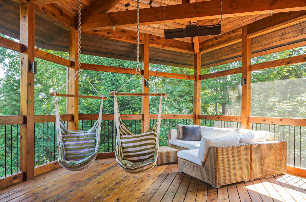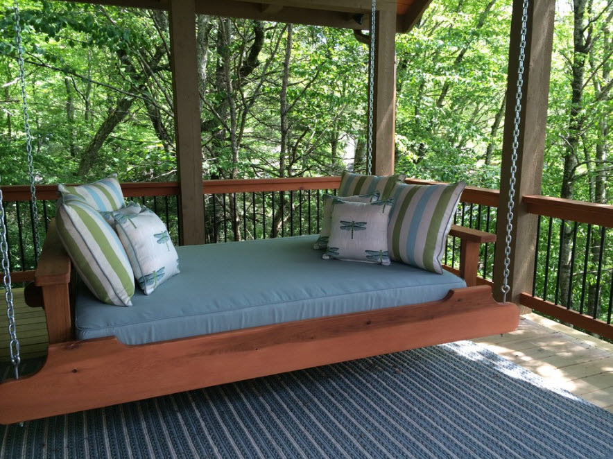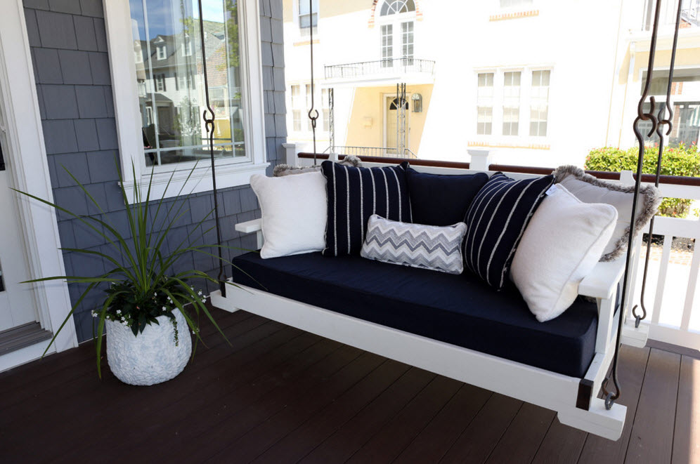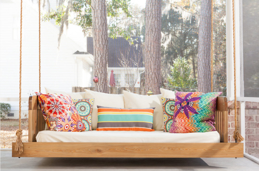 Расположение подвесных вместительных качелей под навесом или на террасе – отличная возможность для организации места отдыха с максимально комфортными условиями. Под крышей террасы вы будете находиться к тени и под защитой от солнечных лучей, здесь не страшен дождь и небольшой ветер. Под навесом или на террасе можно использовать матрасы и подушки с чехлами из тканей, которые склонны к выгоранию на солнце или роскошный текстиль, который вам было бы просто жалко выставлять для воздействия всех возможных природных явлений.