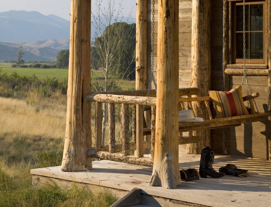 Оригинальные деревянные качели, каркас или все элементы которых выполнены из бревен, прекрасно подойдут к ансамблю загородного дома или дачного участка, выполненного в стиле кантри.