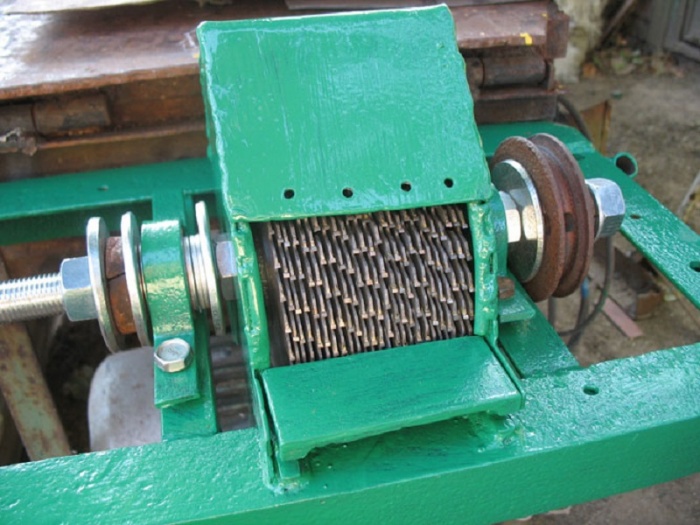 Теперь на валы надеваются шестеренки, для синхронизации движения, и вся конструкция устанавливается на раму и закрепляется при помощи болтов. Затем устанавливается двигатель, который соединяется с валом ременной передачей или цепью. Двигатель лучше брать большой мощности, но с малым числом оборотов. В конце устанавливается и закрепляется приемный бункер. Затем на все вращающиеся части шредера надевается защитный кожух во избежание попадания в измельчитель посторонних предметов.