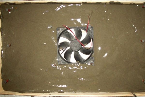 Внутри рамки, в промежутке между рейками и вентилятором, уложена нагревательная спираль и залита плиточным клеем на цементной основе. В результате после высыхания клея – бетонная стенка с подогревом.
