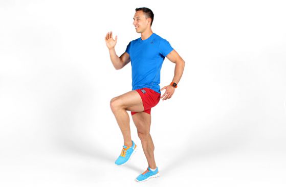 - Руки подняты над собой, одна нога чуть сзади. Делайте махи ногами. При махе – руки вниз. 5 повторений.