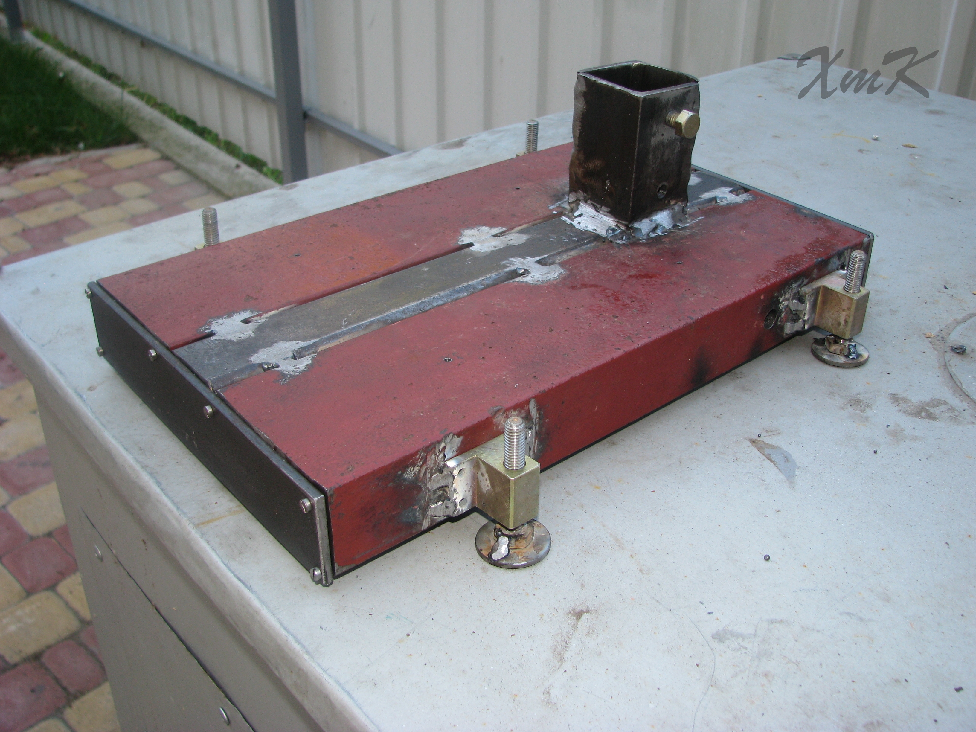 3. Чтобы соорудить саму стойку, следует предварительно выбрать П-образный профиль из стали с габаритами 30х60х30. Затем нужно приварить его к металлическому листу с толщиной 2 мм. По идее сама стойка обязана быть высотой на 6-7 см больше длины самой колонки.