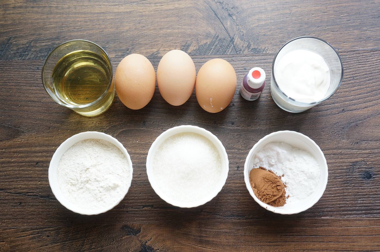 В чаше смешайте муку (340 гр.), сахар (300 гр.), алализованое какао (5 г), 1/4 ч.л. соли, соду (3 г), разрыхлитель (5 г).