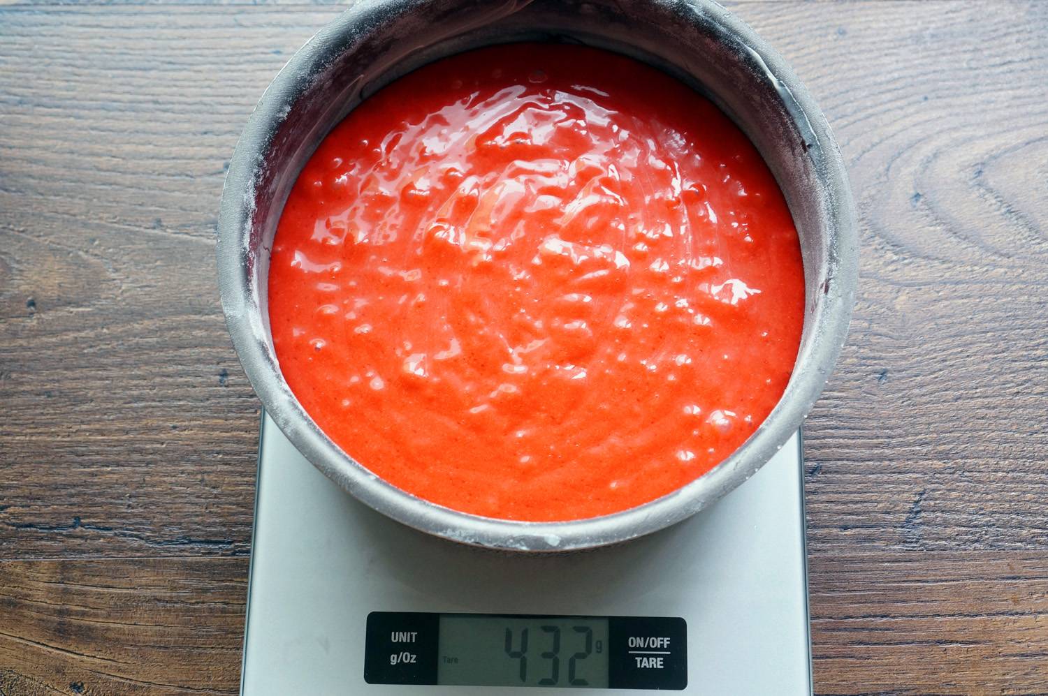 В конце нужно добавить пахту (280 гр.). Я заменил её нежирными сливками 10% (150 гр.) и сметаной 20% (130 гр.), можно просто взять кефир пожирнее. И красный пищевой краситель. Самый качественный и дающий результат — AmeriColor Red Red (или Super Red).